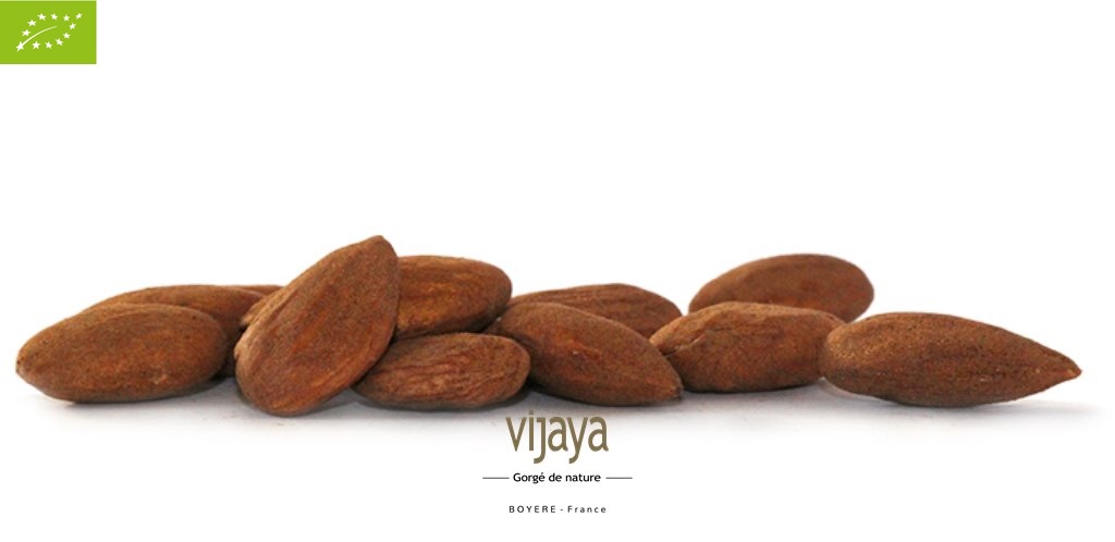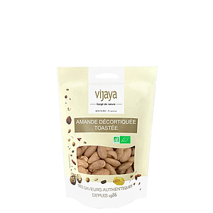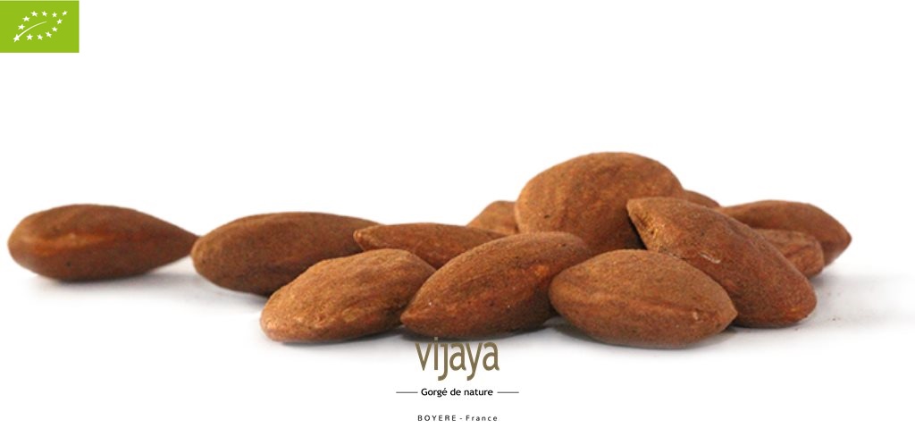 L’amande est un fruit à coque, recouvert d’une enveloppe verte et veloutée au toucher (le brou), qui sèche et éclate à maturité, laissant apparaître une noix. Quand les amandes sont décortiquées et séchées, leur peau est brune. VIJAYA vous propose ses amandes décortiquées en version toastée maison.
