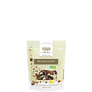 Le Mélange Salade VIJAYA, composé de Raisin Sultanine, Pignon de Pin, Graine de Courge et Cerneaux de Noix, est riche en apports nutritionnels et agrémente facilement les repas.